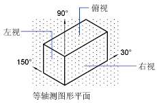 如果捕捉角度是 0,那么等轴测平面的轴是 30 度、90 度和 150 度。将捕捉样式设定为“等轴测”后,可以在三个平面中的任一个平面上工作,每个平面都有一对关联轴: