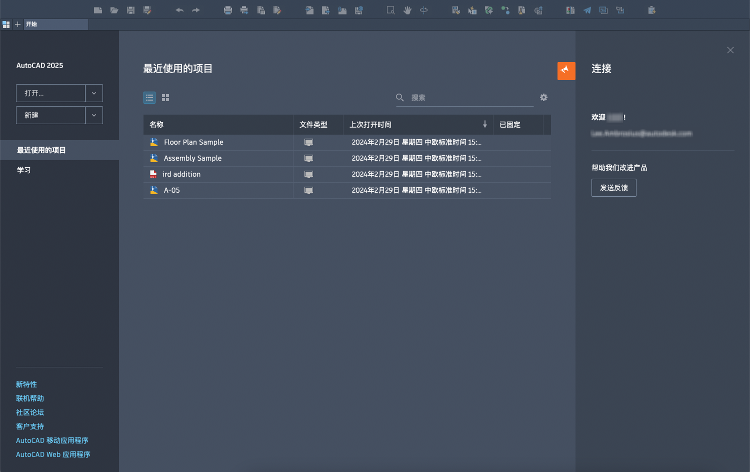 “开始”选项卡默认在启动时显示,让您可以轻松访问各种初始操作,包括访问图形样板文件、最近打开的图形和图纸集、联机和学习选项以及通告。