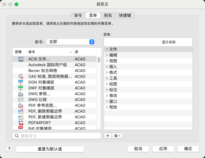 显示让您可以管理菜单中命令和子菜单的菜单。