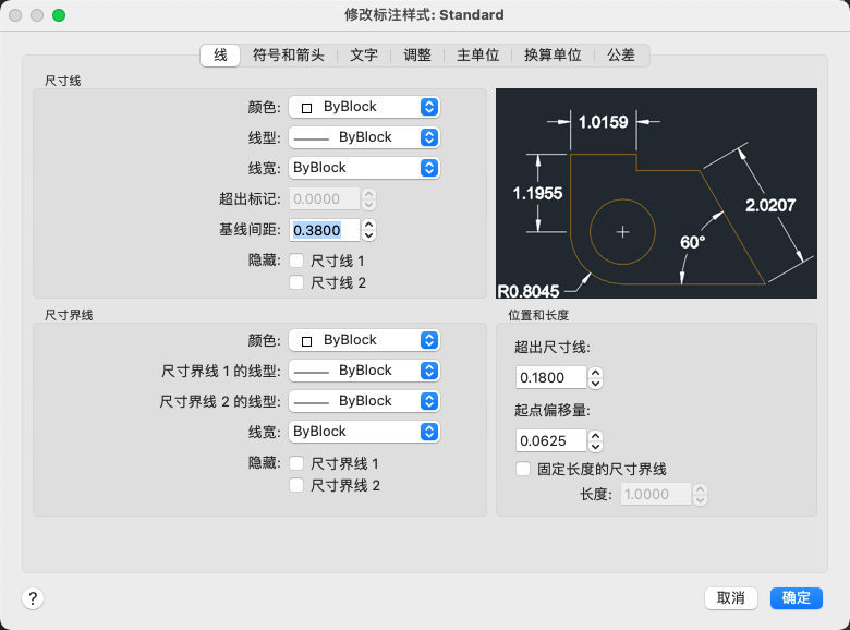 设定尺寸线、尺寸界线、箭头和圆心标记的格式和特性。