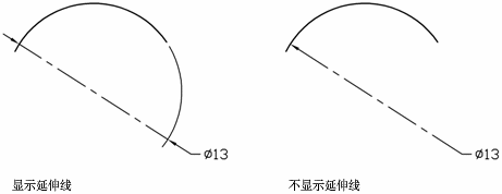 对圆弧进行标注时,半径或直径标注不需要直接沿圆弧进行放置。如果标注位于圆弧末尾之后,则将沿进行标注的圆弧的路径绘制尺寸界线,或者不绘制尺寸界线。取消(关闭)尺寸界线后,半径标注或直径标注的尺寸线将通过圆弧的圆心(而不是按照尺寸界线)进行绘制。