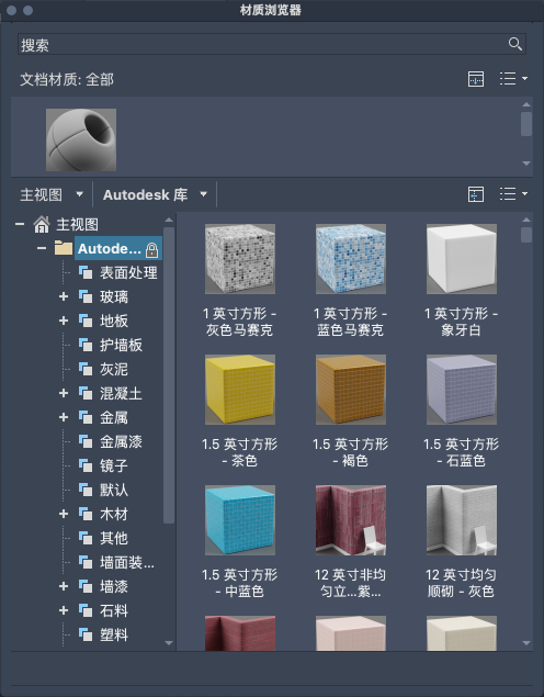 可以通过“材质浏览器”访问标准的 Autodesk 材质库。