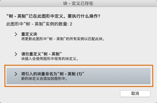 插入块时重命名块定义的新选项,并且已存在其他块定义。