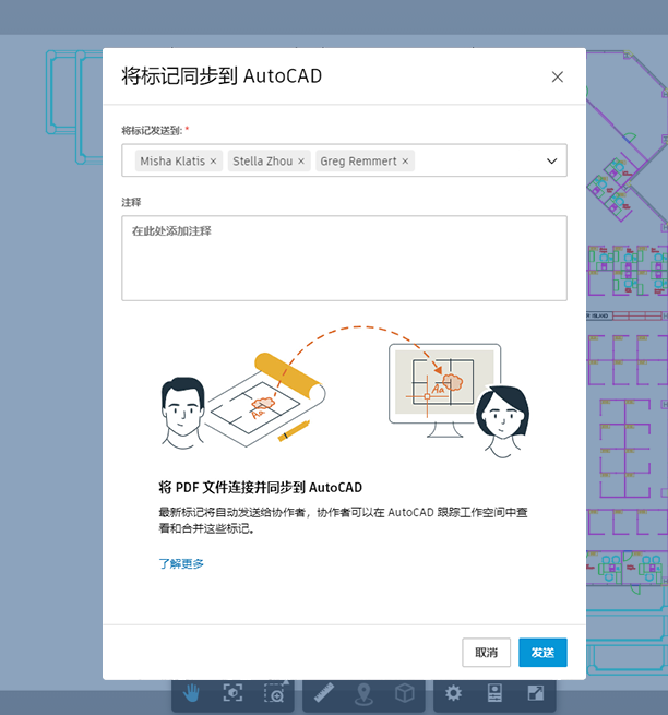 在 Autodesk Docs 中,将标记添加到 PDF 文件中,然后通过 Autodesk Docs 与可以在 AutoCAD 跟踪环境中查看标记的协作者共享该 PDF 文件。该 PDF 文件持续连接到 AutoCAD 图形,这意味着对 Autodesk Docs 中的 PDF 标记文件进行更新和修订时,协作者可以在 AutoCAD 中看到这些更改。