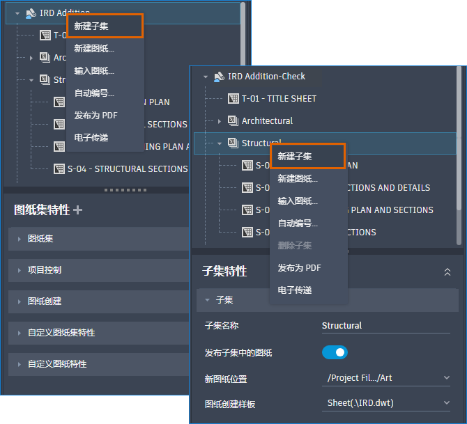 要发布多张图纸,请在按住 Ctrl 键的同时选择子集或图纸,然后单击鼠标右键。