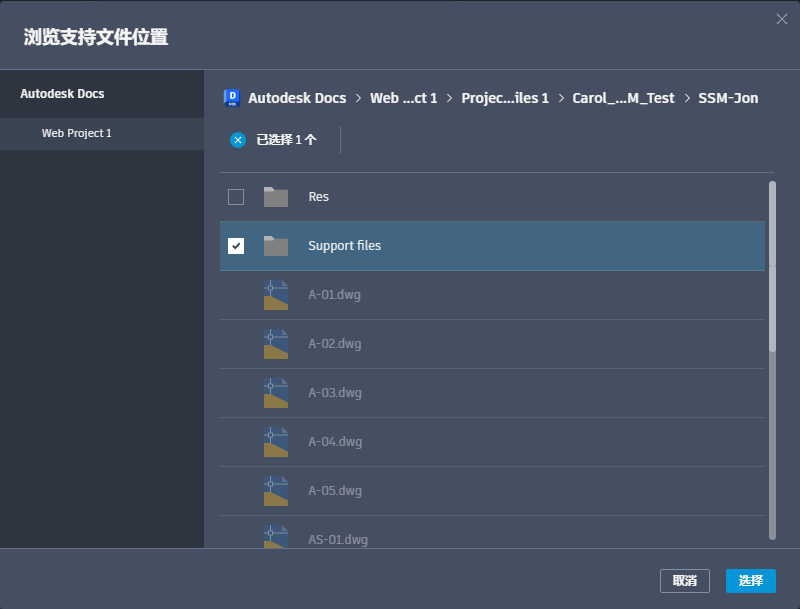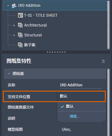 - 在适用于 Web 的图纸集管理器底部的“图纸集特性”窗格中,展开“图纸集”,然后单击“支持文件位置”下拉列表。
