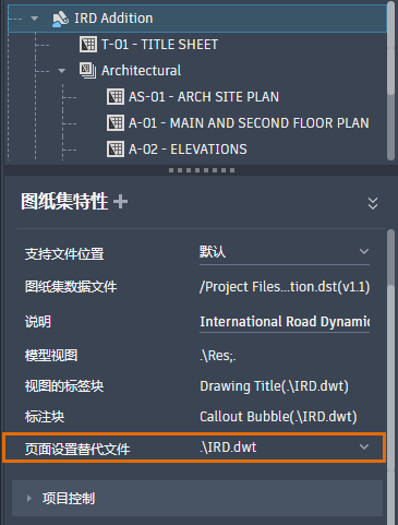 - 在适用于 Web 的图纸集管理器底部的“图纸集特性”窗格中,展开“图纸集”,然后单击“页面设置替代文件”下拉列表。