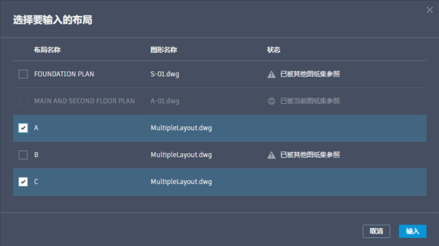 - 选择要作为图纸输入到当前图纸集或子集中的布局。