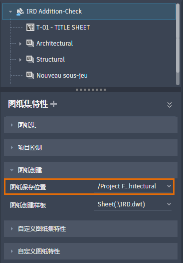 - 在适用于 Web 的图纸集管理器底部的“图纸集特性”窗格中,展开“图纸创建”,然后单击“图纸存储位置”下拉列表。
