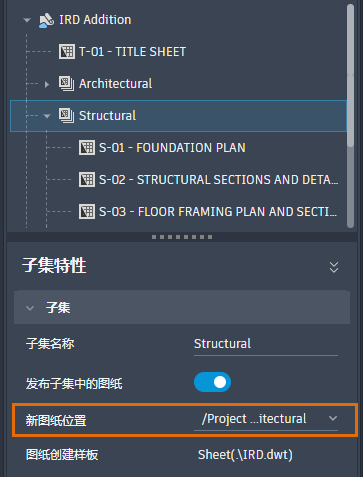 如果已选择子集,则在“子集特性”窗格下展开“子集”,然后单击“新图纸位置”下拉列表。