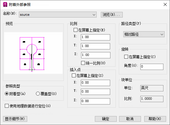 。在“选择参照文件”对话框中,导航到“source.dwg”,选中它,然后单击“打开”。