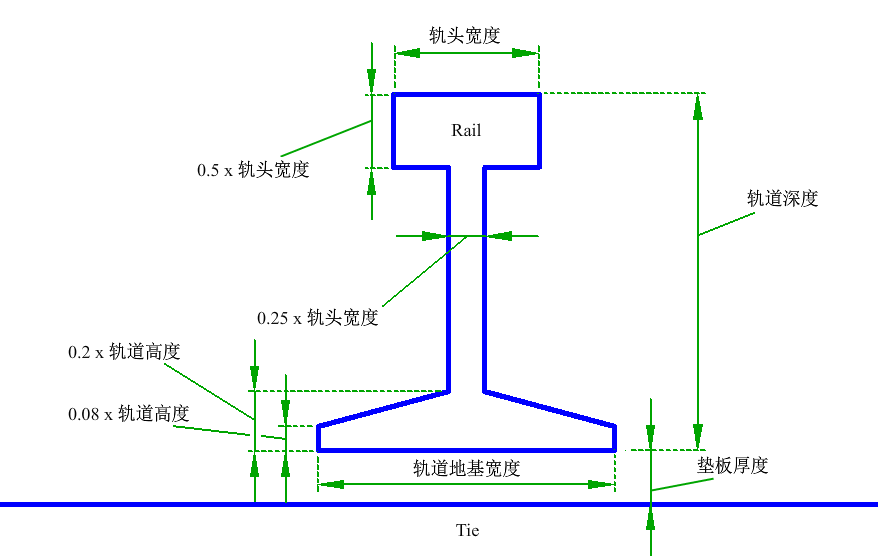 | 轨道地基到粗碴 | 轨道底部到粗碴顶部的距离。若该值等于垫板厚度,则粗碴顶部与枕木顶部平齐。 | 数字(非负数) | 1"