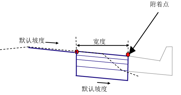 附着点将确定加宽部分外侧边缘的偏移和高程。加宽部分内侧边缘以及叠加部分内侧边缘的位置将使用给定的宽度和坡度来确定。路线可用于替代给定的数值宽度。如果给定了叠加纵断面,则将计算叠加部分内侧边缘处的纵断面高程与附着点之间的坡度。