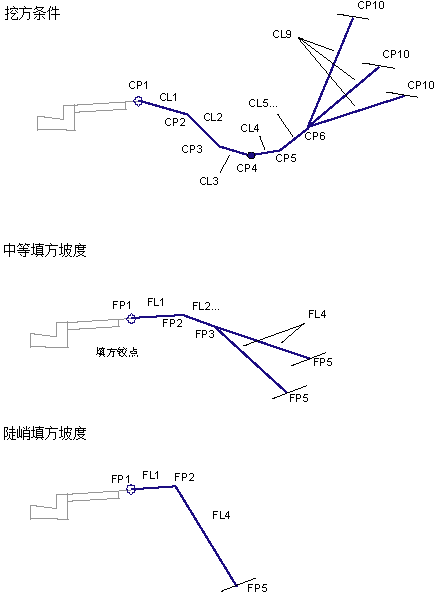 “中等填方坡度”连接超过“中等填方最大高度”时使用的填方坡度 |