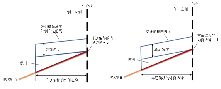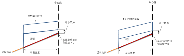 外侧或内侧车道超高将替换理想横向坡度。铺装层的更正的横向坡度值将由横断面的超高表定义,而不是由理想横向坡度定义。