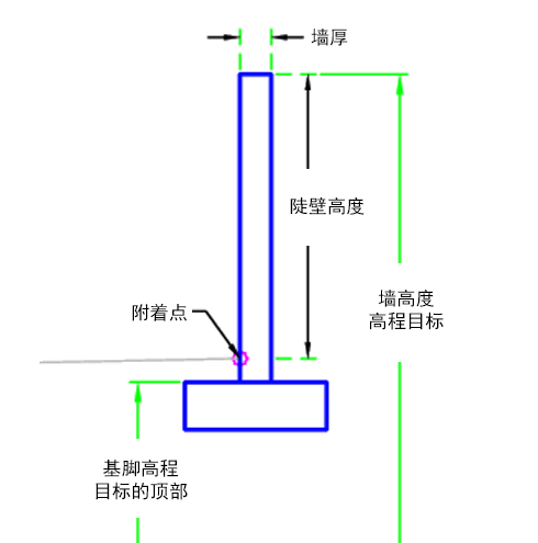| 陡壁高度 | 可用于替代墙高度,将墙顶高程关联到纵断面高程。以下对象类型可用作用于指定高程的目标:纵断面、三维多段线、要素线或测量地物。 | 可选 |