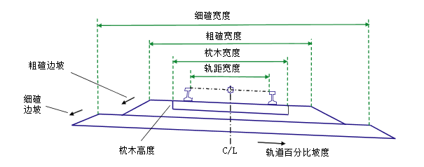 将基于提供的输入参数值,计算并放置轨道、枕木、粗碴和细碴连接。如果“轨道百分比坡度”非零,那么将在低侧上的轨道中心处保持道路纵断面高程。完工坡面、枕木、粗碴和细碴连接将保持“轨道百分比坡度”。