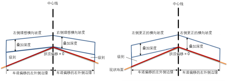 外侧或内侧车道超高将替换理想横向坡度。铺装层的更正的横向坡度值将由横断面的超高表定义,而不是由理想横向坡度定义。