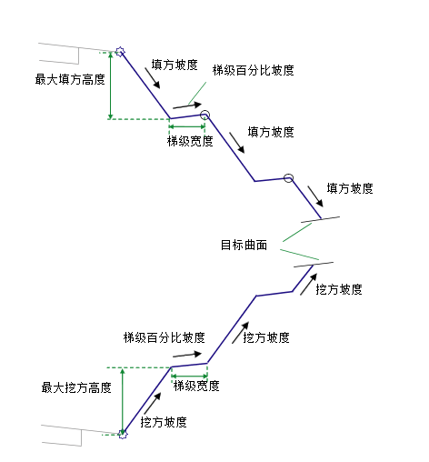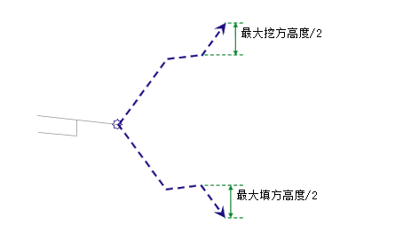 在布局模式中,此部件按照最大高度绘制初始挖方和填方坡度,然后绘制一个梯级,最后绘制高度为“最大高度”一半的挖方和填方边坡。边坡连接的终止箭头指向外部。