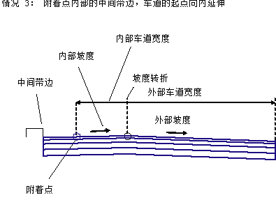 行车道内侧边缘:根据上图中显示的三种情况计算行车道内侧边缘的位置。如果指定了“中间带边缘”路线,并且该路线位于车道的附着点外,将从附着点处以车道坡度向外平移内侧边缘(第二种情况)。如果“中间带边缘”路线位于车道的附着点内,将从附着点处以内侧车道坡度向内平移内侧边缘(第三种情况)。如果未指定“中间带边缘”路线,或者未在里程处找到指定的路线,内侧边缘将保留在附着点处(第一种情况)。