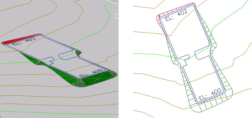 台阶式偏移要素线已放坡到 EG 曲面。请注意,挖方和填方坡度分别以红色和绿色显示时,放坡组内部仍有开放区域。在下一练习中,您将学习填充这些区域并应用相应的放坡样式。