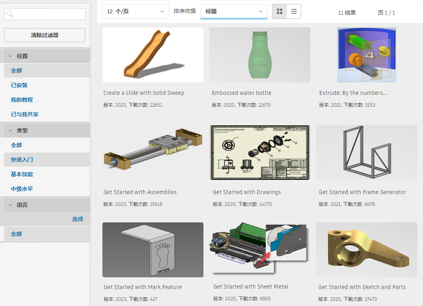 将“类型”过滤器设置为“快速入门”,以查看介绍在工程图中绘制草图、对零件进行造型、创建部件以及为设计制作文档的基础知识的教程。