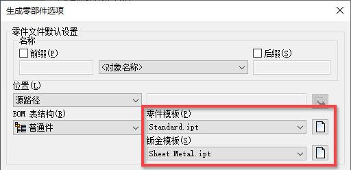 “工具”>“文档设置”>“建模”选项卡 >“生成零部件选项”对话框新增了“钣金模板”选项,可让您选择或浏览到用于创建新钣金零件文件的模板。