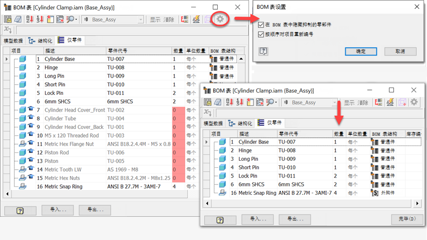 部件 BOM 表:新的“BOM 表设置”选项可关闭受抑制零部件的可见性,并按顺序对条目进行编号。