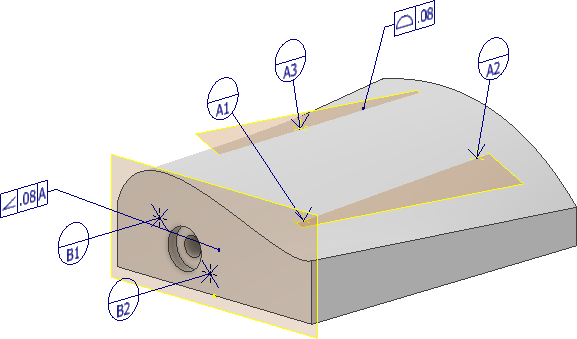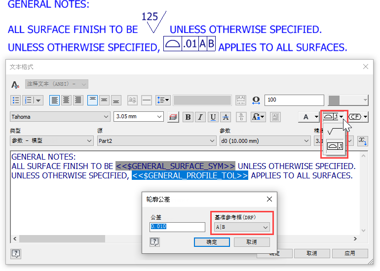 形位公差符号:形位公差符号上的“遍布”符号。使用“形位公差符号”对话框的“轮廓”下拉菜单中新的“遍布”选项。