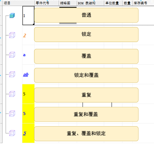 BOM 表条目号具有多个显示状态,以指示正常、锁定、替代和重复状态或各种组合状态之间的差异。