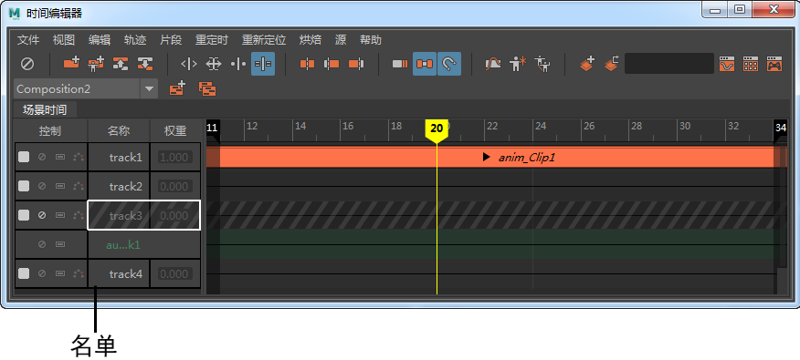 位于时间编辑器左侧的时间编辑器名单列出了合成中的各个轨迹。