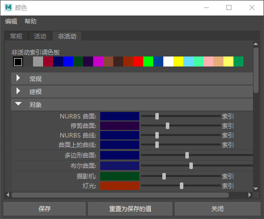 “非活动”(Inactive)选项卡可用于设置未选择对象的颜色。使用“非活动”选项卡可更改下列区域或工具中的默认颜色:“常规”(General)、“建模”(Modeling)、“对象”(Objects)、“组件”(Components)、“变形器”(Deformers)、“动画”(Animation)以及“平滑网格预览”(Smooth Mesh Preview)。