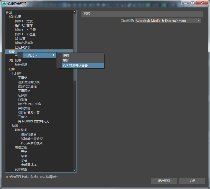 “编辑预设”(Edit Preset)对话框分为两部分,在左侧部分中添加了 FBX 选项的树视图。