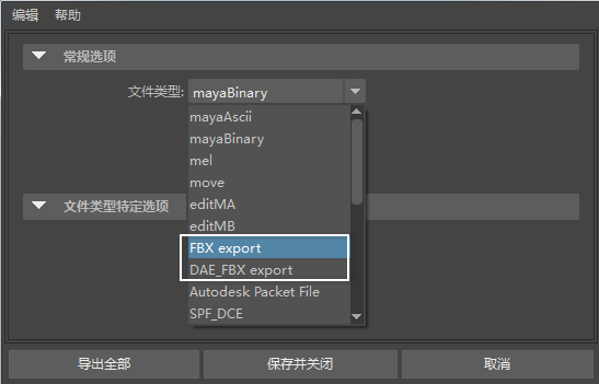 下次加载 Maya 时,新预设将显示在 Maya FBX 插件中。