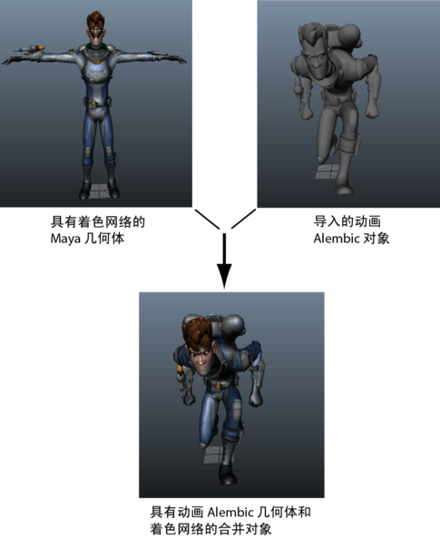 导入 Alembic 缓存时,可以使用原始 Maya 对象合并缓存的对象。合并时,Alembic 几何体将替换场景中的原始对象。Alembic 对象的动画数据将保留,并继承场景对象的着色数据。若要进行合并,Alembic 对象必须与源几何体具有相同的名称和对象层次。场景和 Alembic 对象的拓扑不需要匹配。