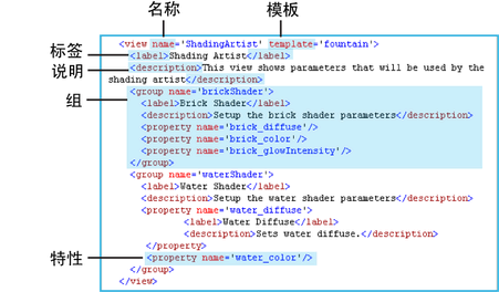 视图使用 <view> 元素进行定义。视图中的属性使用 <property> 元素从模板进行引用。属性可以使用 <group> 元素进行分组。特定于视图的覆盖可以选择性地为某些模板信息提供。显示在界面中的属性标签和描述文本可以特别地按视图分别进行自定义(如果需要)。