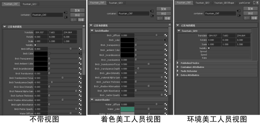 下图显示了喷泉资产的“属性编辑器”(Attribute Editor),第一个图片未指定任何视图,后两个图片则分别为团队中的着色美工人员和环境美工人员创建了两个不同视图。每位美工人员在使用喷泉资产时,系统只为其提供所需的属性。