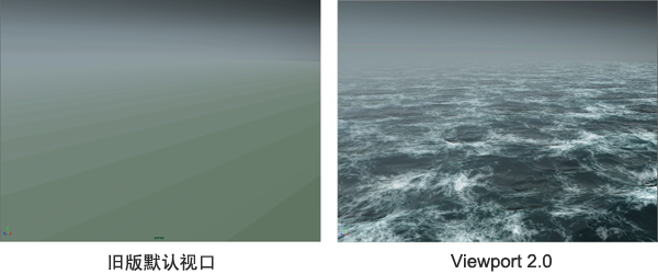 “海洋着色器”(Ocean Shader)应用于平面时,旧版视口与新版视口之间的差异。