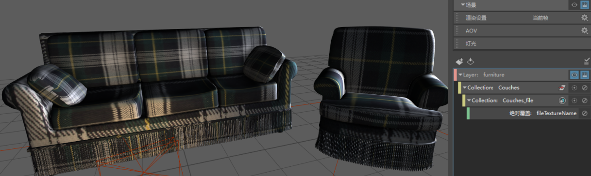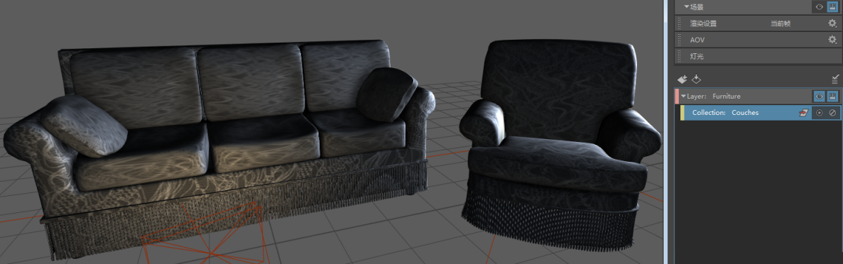 - 将“家具”(Furniture)层设置为可见,然后选择“沙发”(Couches)集合,再选择灰色纹理文件节点。