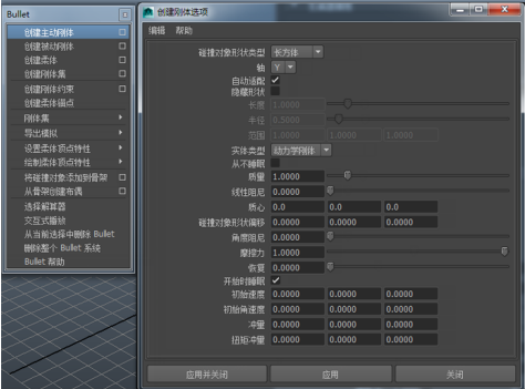 如果选择“创建主动刚体”(Create Active Rigid Body)后选择网格,将使用网格的凸面外壳作为其默认碰撞对象从而使刚体与网格关联。如果没有选择网格,将创建一个刚体,使用一个长方体作为其默认碰撞对象形状。可以通过在 bulletRigidBodyShape 节点“属性编辑器”(Attribute Editor)的“刚体特性”(Rigid Body Properties)部分中编辑“实体类型”(Body Type)属性,来更改刚体类型。创建新刚体时,还可以更改所使用的默认设置,方法是点击 Bullet 菜单条目右侧的选项框。