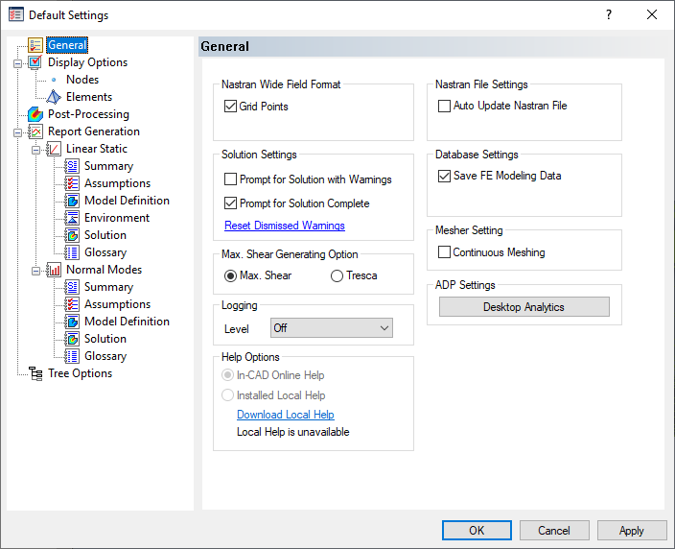常规 - 允许用户设置 Nastran 字段格式,以及求解、日志记录、帮助、数据库、文件、网格生成器、ADP 和技术预览的各种设置。