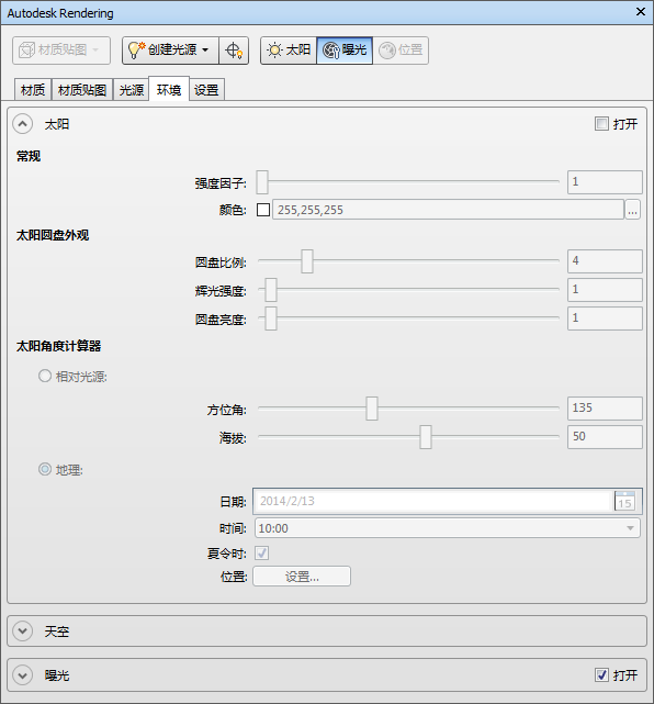 使用“环境”选项卡可配置太阳和天空特性以及曝光设置。