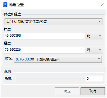 使用此对话框可在模型中设置地理位置的纬度、经度和北向。“场景视图”会显示太阳在自定义时区的自定义位置。