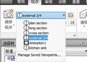 单击“视点”选项卡 >“保存、载入和回放”面板 >“保存的视点”下拉菜单,然后选择要审阅的视点。