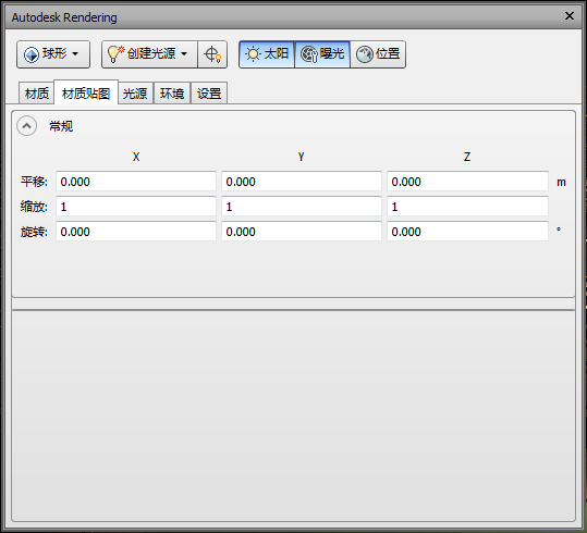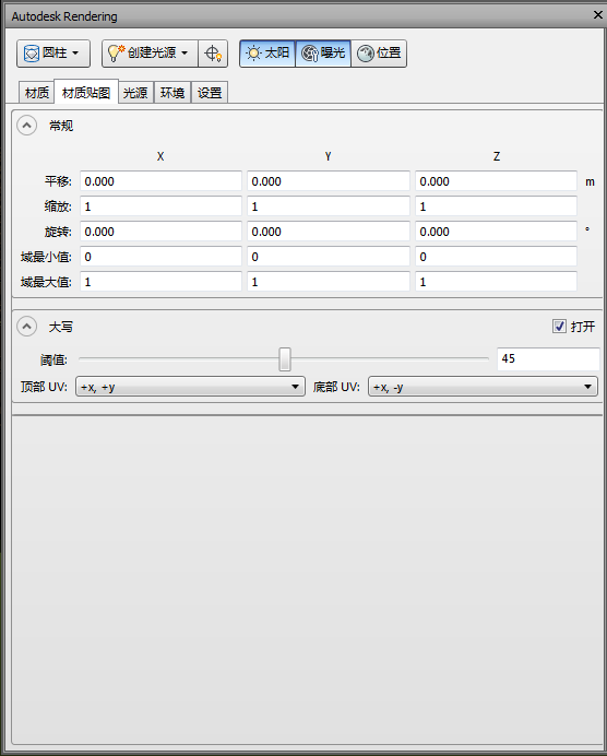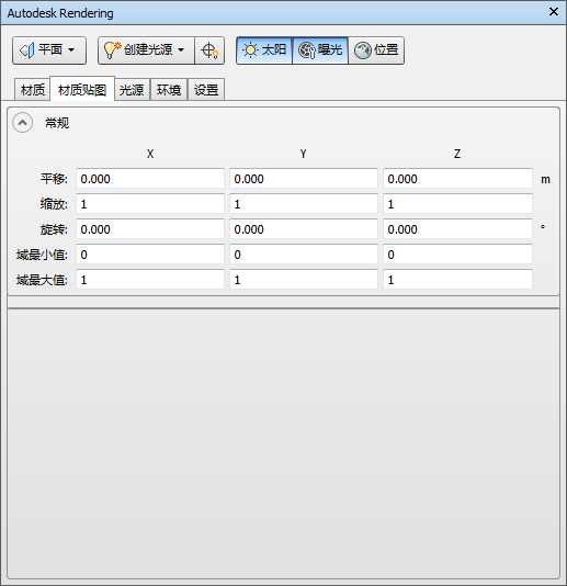 材质贴图定义如何将三维坐标和法线转换为二维纹理坐标 (UV),从而用于从纹理贴图查找颜色和其他细节。每个特定贴图都具有不同的“模板”,控制如何执行贴图。在“常规”部分的“平移”、“缩放”和“旋转”字段中,先定义应用到每个三维坐标和法线的变换,然后再为将三维点转换为纹理坐标的每个特性贴图类型应用模板。“域最小值”和“域最大值”字段中的值在许多贴图模板中用于确定坐标空间(X、Y、Z)中的哪个范围(最小值到最大值)映射到纹理空间中每个坐标的 0 到 1。