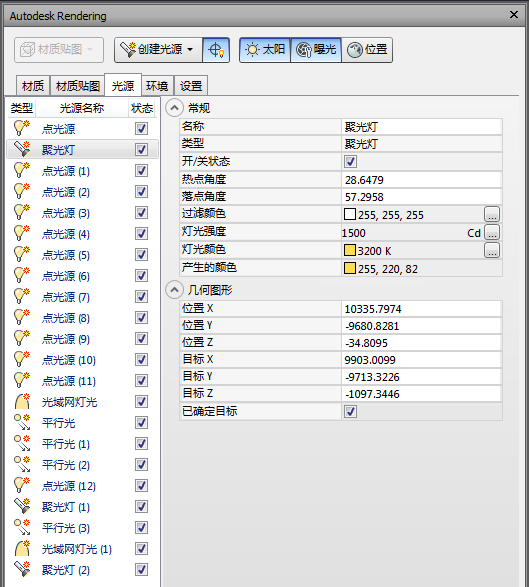 几何图形特性控制光源的位置。如果光源是聚光灯或光域网灯光,则有更多的目标点特性可用。