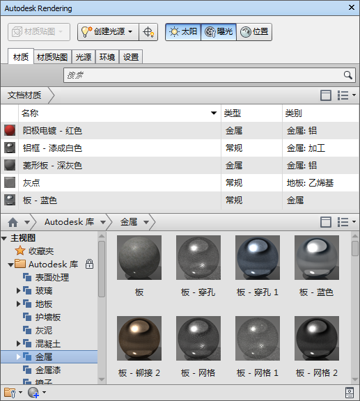 使用“Autodesk Rendering”窗口可以访问和使用材质库、光源和环境设置。