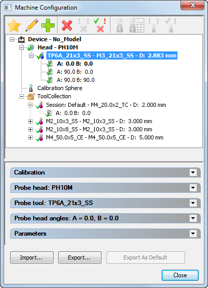 若要查看和管理测头数据库并显示 CMM 的校准详细信息,请单击“工具”选项卡 >“测量设备”面板 >“测头”。正在使用的测头及其当前校准的详细信息将显示在“测量设备配置”对话框中。