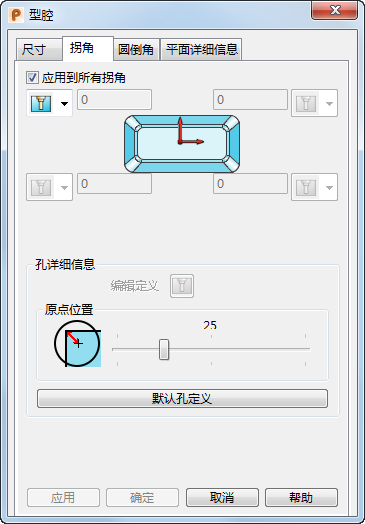 原点位置 - 移动滑块可相对于型腔的拐角放置孔的原点。该位置以孔最大半径百分比的形式表示。