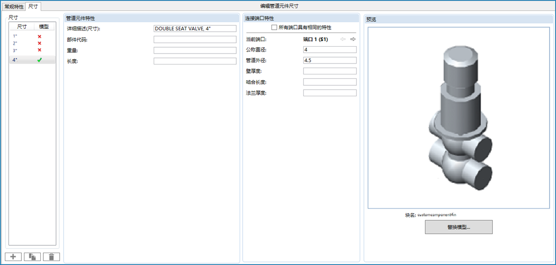 - 在“管道元件特性”中,输入详细描述(尺寸)。例如,双座阀,4"。